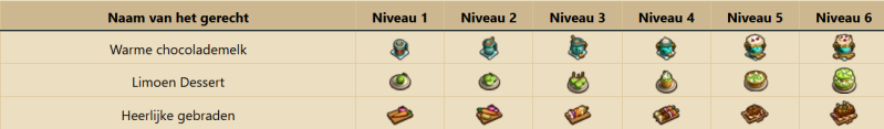 Er zijn in totaal 3 soorten gerechten en elk bestaat uit 6 verschillende niveaus (tiers). U kunt alle beschikbare gerechten bekijken in de onderstaande tabel:
