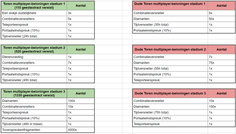 Zoals je kunt zien, zijn er nogal wat nieuwe toevoegingen, evenals een aanzienlijke toename van het aantal veelgevraagde Koninklijke Restauraties en Spreukenfragmenten! We willen ook enkele veranderingen noemen die minder positief lijken, en uitleggen waarom ze plaatsvinden: Tijdreductiespreuken werden verzameld in plaats van gebruikt, waardoor ze minder waardevol werden. Daarom zijn ze aangepast (-45%) om ruimte te maken voor nuttigere beloningen om ontmoetingen te overwinnen, zoals vitaliteit stoot. Mystery Chests krijgen ook verschillende beloningen, zodat elke kist interessante en waardevolle items bevat. Gratis diamanten zijn nog steeds beschikbaar, zij het in verminderde (-55%) hoeveelheden. Door dit te doen zorgen we ervoor dat de economie van het spel gezond blijft en bieden we beloningen van gelijke of hogere waarde. Je kunt nog steeds diamanten sparen om te besteden aan premium gebouwen of koninklijke restauratie, alleen in een iets langzamer tempo. We hopen ook dat, aangezien we blauwdrukken, spectrale stenen, koninklijke restauraties en vitaliteit stoot uitdelen, de diamanten die je anders daaraan zou uitgeven, kunnen worden bewaard en voor iets anders kunnen worden gebruikt. Magische woningen en werkplaatsen zijn verwijderd, waardoor ze weer hun oorspronkelijke doel hebben: exclusieve premiumgebouwen! Het was ook de bedoeling dat deze gebouwen zouden worden geüpgraded met blauwdrukken, wat niet zo vaak gebeurde omdat ze zelf als beloning beschikbaar waren. Je kunt ze natuurlijk nog steeds krijgen met de gratis diamanten die je in het spel krijgt. We hopen dat deze nieuwe beloningen je betrokken houden bij de Toren! We kijken uit naar al uw feedback, omdat we van plan zijn deze zorgvuldig door te nemen en waar nodig aanpassingen aan te brengen!