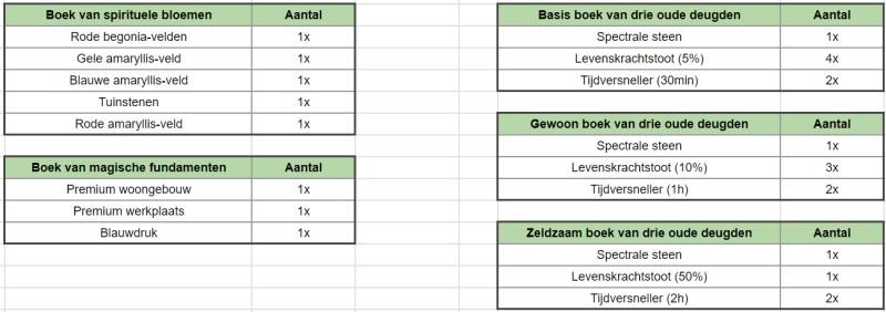 en 3 nieuwe boeken van drie oude deugden toegevoegd, die spectrale stenen, levenskrachtstoten en tijdsboosters bieden - hoe verder je komt, hoe beter de boeken die je krijgt.